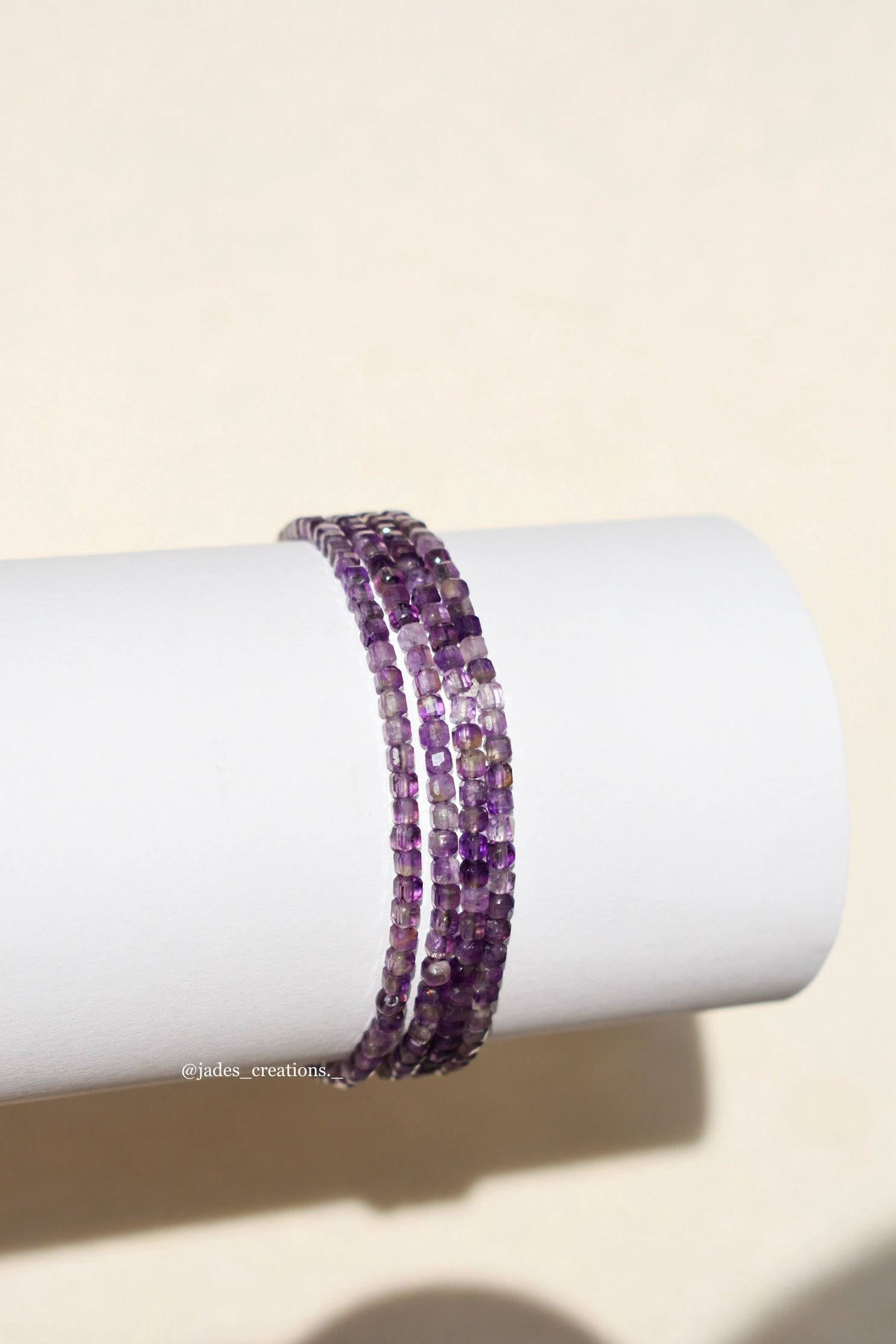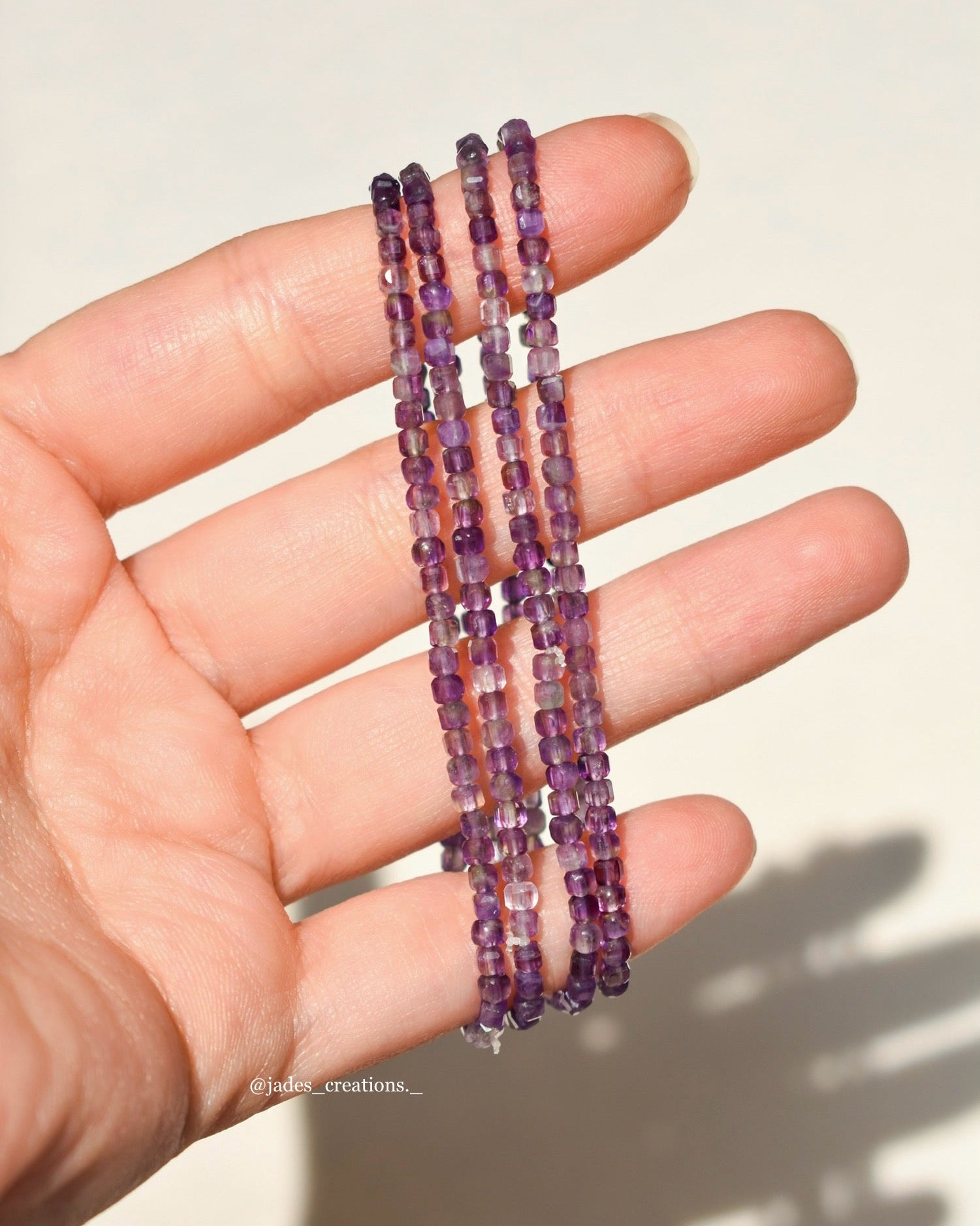 Bracciale realizzato con filo elastico di alta qualità e con perline di ametista naturale da 2mm, lungo 16,5cm.
