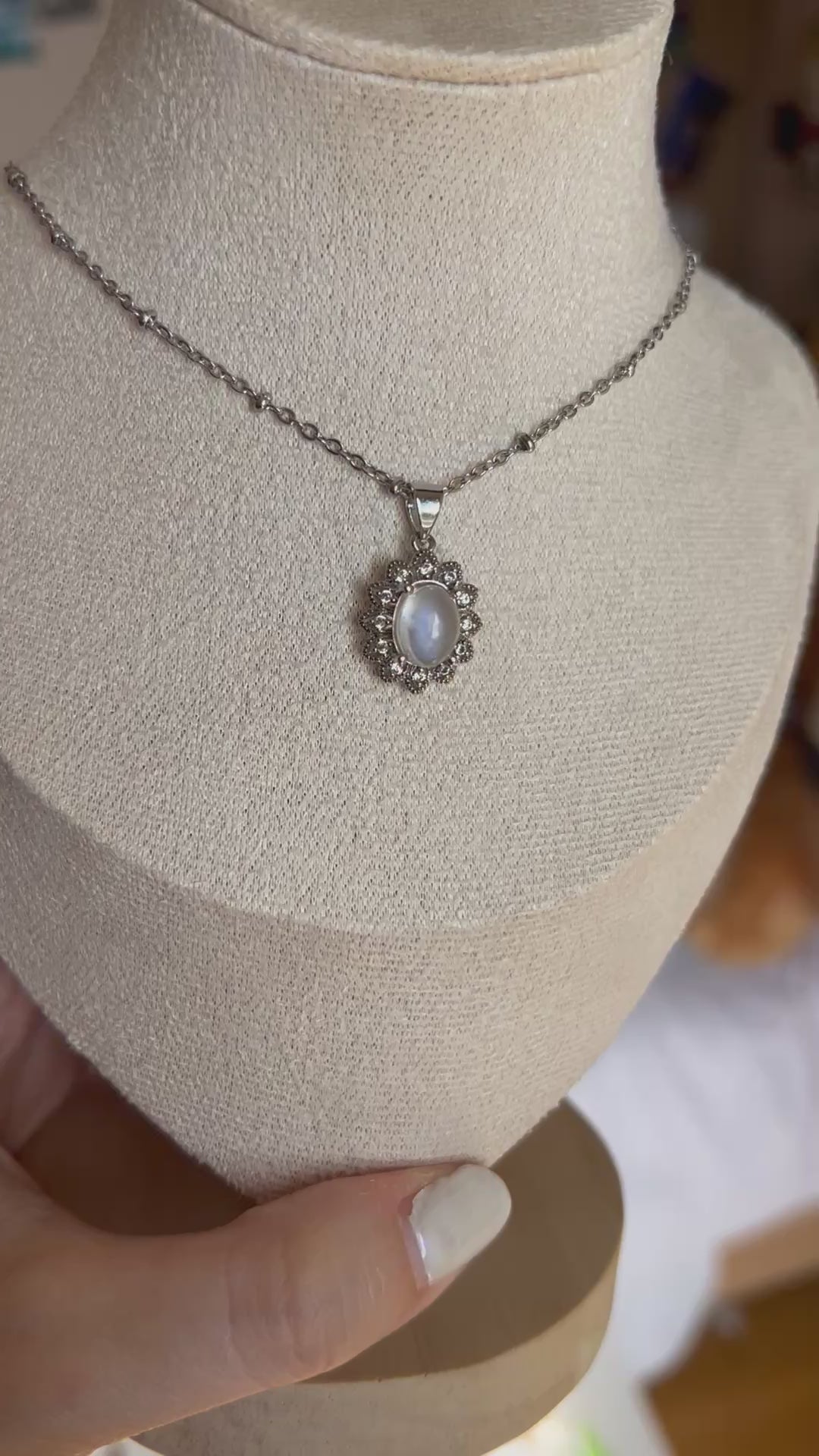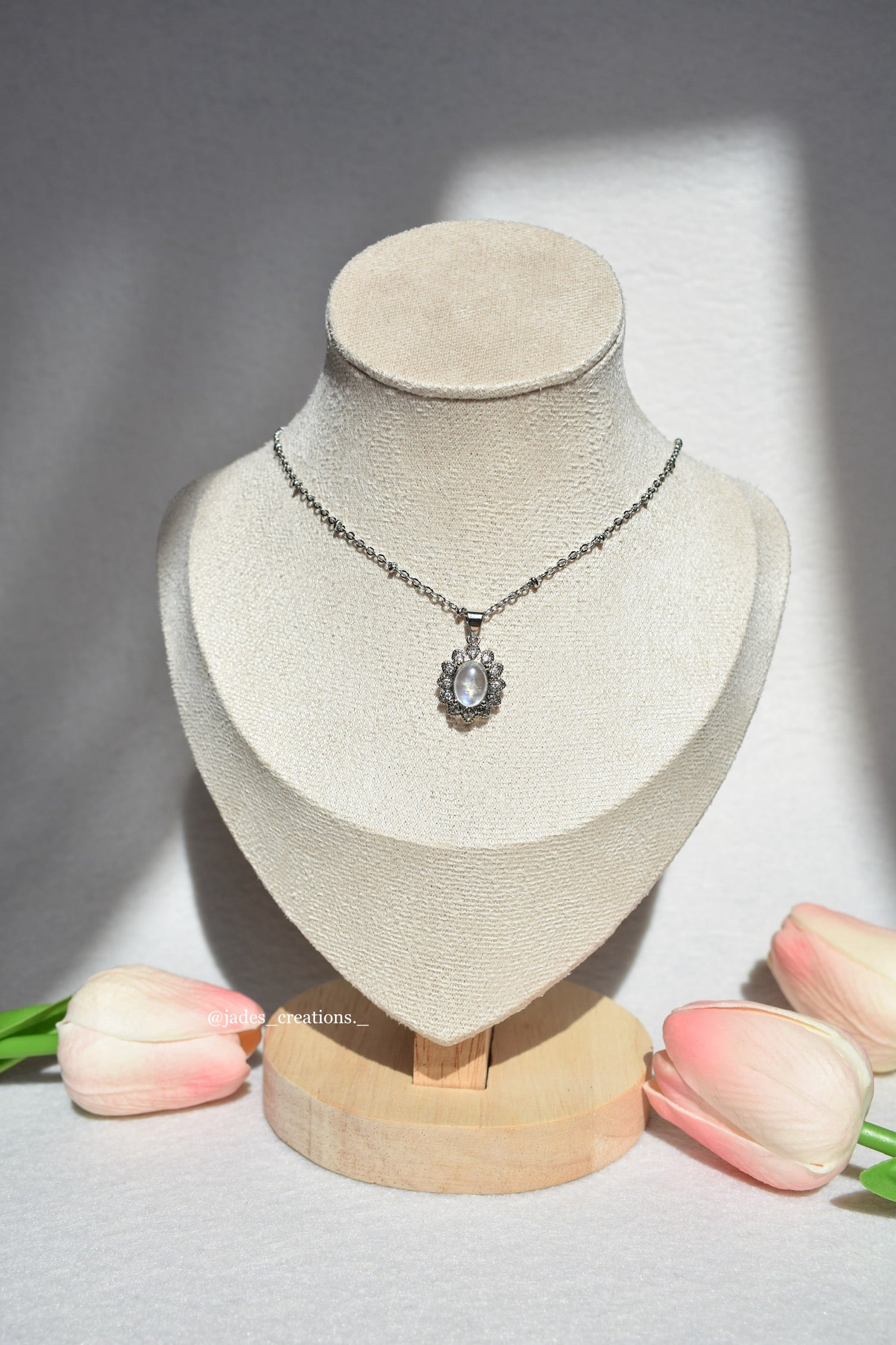 Collana in acciaio inox con ciondolo in Pietra di Luna, lunga 40cm + 5cm di catenella regolabile.